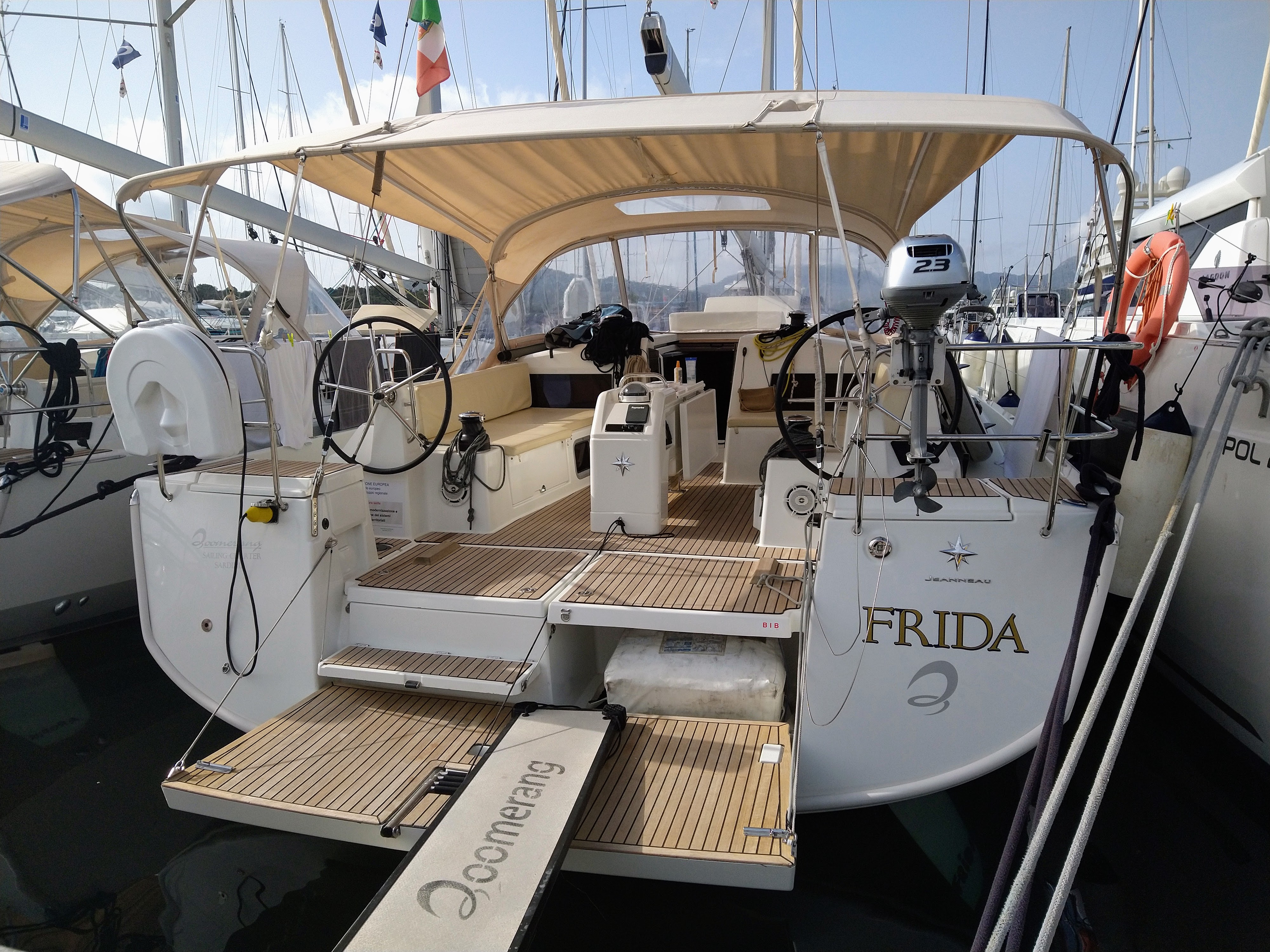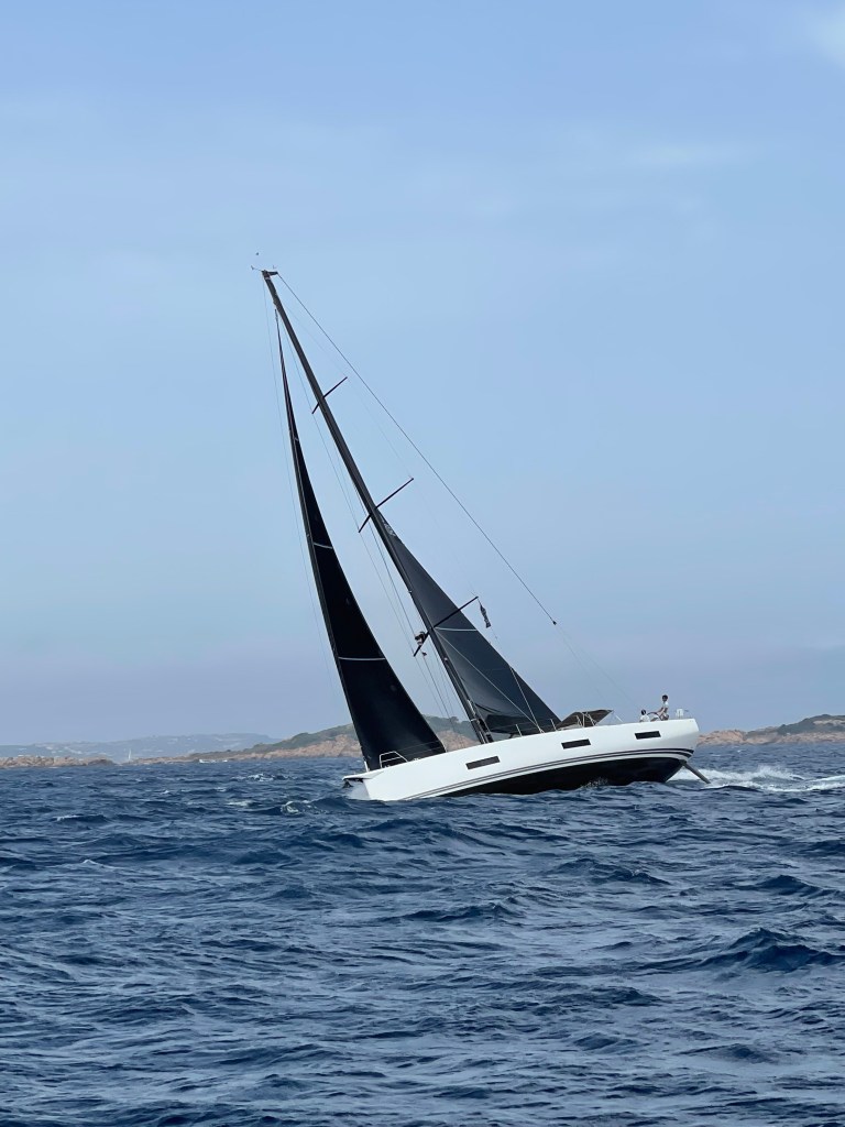 We opted to sail to Cannigione which was recommended by Boomerang and someplace we could pick up our first mate. Initially we went to Porto Palma anchorage for an anchor and a swim. The sailing conditions right away were sporty and we got to see some race boats out on the water. Coming into Cannigione harbor, Boomerang had given us a specific woman to radio in and ask for. When we approached we saw a managed mooring ball field on the outside where the manager approached us. In retrospect this was the right place to go, as the guy was super friendly and spoke great English. Yes, we would have had to dinghy back and forth and dinghy all of our first mate’s gear on board, but still a friendly understandable bird in the hand is better than the unknown. Of course hindsight is 20/20! Second issue was we did not actually have to radio in. There was plenty of space and we didn’t realize we were boxing ourselves in by committing to one place. But rule followers and recommendation followers, we radioed into the port and had our first difficult to understand exchange. We then started coming into the harbor, and saw a long concrete dock with two outstanding places to pull in and med moor. However, these places were owned by someone else than the woman we had radioed. When we tried to dock there she called and told him we were her customers so he had to wave us off. Going into her concrete dock, was already stressful given we couldn’t understand her well and then the depth meter started setting off an alarm just as we started the approach to the fairway. It went downhill from there. The constant alarm from the depth meter combined with a strong cross wind and then instead of upwind line getting passed in we gave them the downwind line (never do this in a med mooring). Unfortunately I thought we were seconds away from getting the other line on and could not concentrate through the woman yelling “More thrusta” and thought she meant more throttle, when she actually meant bow thrust. I did not realize how badly we were getting blown and that the other helper on the dock and our crew just could not get the upwind line. Then the dockhand just let go of our downwind line and said you are on your own and that’s when we narrowly avoided a massive superyacht on our downwind side and my sister-in-law’s hand got injured trying to keep us off. I think her arm was in danger of getting broken too, as my husband yelled for her to get it out of the area between the boats. Yeah. Not good. Really not good. Many of our crew were there pushing off including my daughter and while we managed to not hit, it was a close call. As painful lessons tend to be– it was very instructive in teaching that you need to have your stuff together in advance – I mean really together – and not get ruffled by the dock people. Also know your bailout points and do it – and bail out early when it’s not going right.