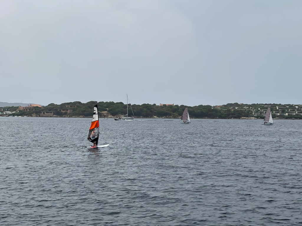 For Monday night we decided to anchor out at Isola Spargi and along the way check out Porto Pollo, which is famous for windsurfing. We did a short time at anchor there and swam to shore. After that we proceeded to the Isola Spargi anchorage. It was pretty crowded so we anchored at the back. The charter company had told us the big weather was coming on Tuesday night and the forecasts were showing this too. We had a great time cooking at anchor and then a few of us decided to dinghy into the island shore and check it out. There we saw a group of wild boar, both cool and a tiny bit scary. They were smelling everything so we followed what the other people were doing and got in the water. When wee returned to the boat, I thought we would want to explore again in the morning before departing, so we left the dinghy out. And we left the motor on the dinghy – mistake. We were woken sometime around 5 or 6am with huge winds and rain. Plus the wind had shifted 180 degrees and therefore all the boats were getting blown towards the island and many were dragging anchor. It was a completely chaotic scene as many boats were opting to pull up anchors and depart. There was one boat pulling up anchor that was getting blown back towards our boat and the captain was clearly stressed that they were losing control and would not get the anchor up fast enough. I remembered them from the previous night as they had their big blow up unicorn on the back and now that was coming towards us and the captain was looking nervous. We quickly decided to pull anchor and head back to Porto Pollo which was protected from the new wind direction. In the chaos, did we even remember the dinghy was behind the boat. Once we pulled anchor and started moving, we very quickly noticed the dinghy but it was upside down. Uh oh – very expensive lesson. We got it on board quick and efficiently however, we had dunked the motor and while we quickly rinsed it with fresh water, we did not have the ability to figure out how to fix it after that.