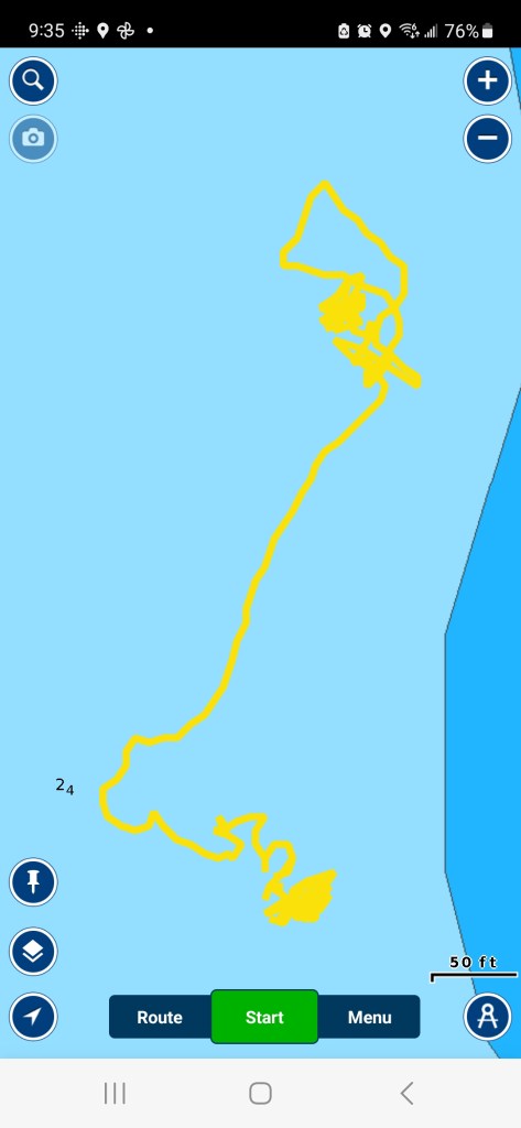 Shows both anchoring locations. By morning we were getting pretty close to the dark blue shallows.