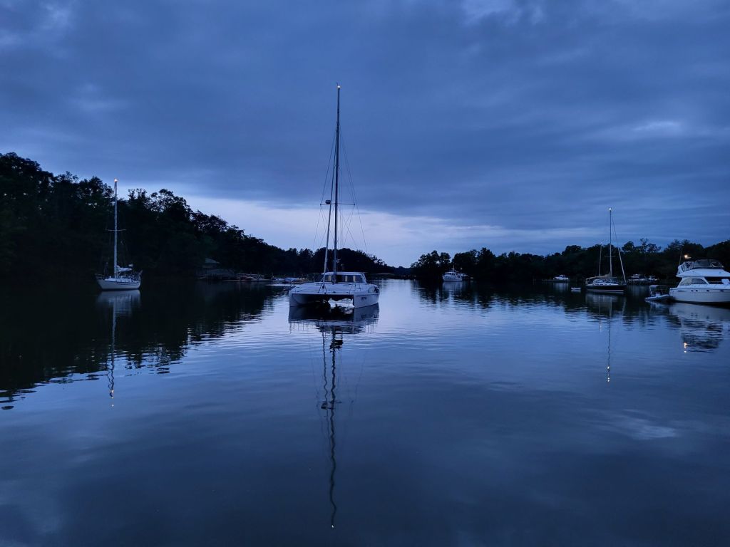 The lack of sleep and stressful experience motivated me to have a good 30-45 minute conversation with my anchoring mentor the next evening to figure out what had gone wrong. We determined that it was likely the same error made twice but not as badly the second time since it held for much longer. The first time I believe we wrapped a lot of chain and never set. The second time I believe we had too much chain on top of the anchor as well. I think it did set but could have had one wrap around the bottom so that when the wind shifted a bit in the early morning the anchor came loose. We also determined that one of the reasons for the piling chain was the very shallow depth of the anchorage. It was 7 feet and Blue Dolphin has a 6 foot draft.